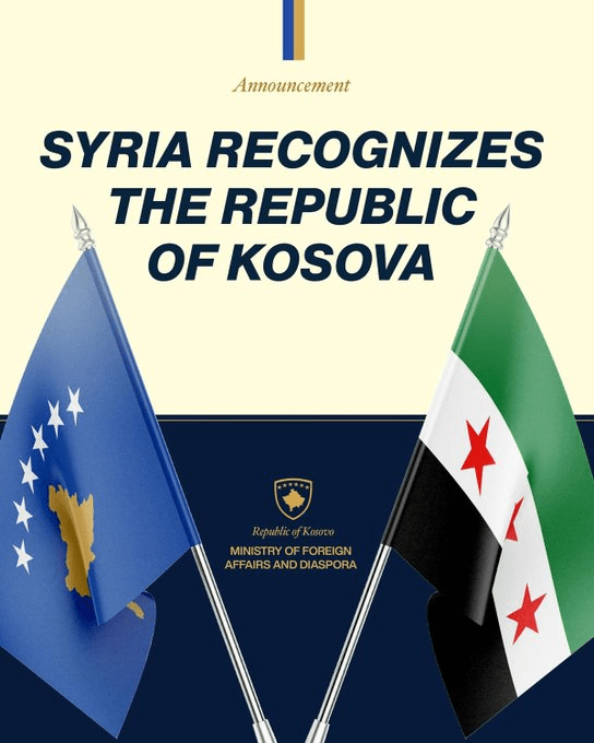 Η Συρία του Αλ Σάρα επίσημα αναγνώρισε την ανεξαρτησία του Κοσσυφοπεδίου το κράτος του Κοσσόβου στη βάση του δικαιώματος του αυτοκαθορισμού.Η Συρία έγινε το 120ο κράτος που αναγνωρίζει την ανεξαρτησία και την κυριαρχία του Κοσσυφοπεδίου. Όταν αναγνωρίσει και το ψευδοκράτος της Β Κύπρου τότε θα πούμε ότι μόνοι μας βγάλαμε τα μάτια μας που κατά επιταγήν Ισραηλινών πολεμούσαμε τόσο καιρό τον Άσαντ. Οι σύμμαχοι ήδη μας σκάβουν το λάκκο.
