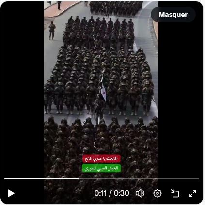 Στις ψευδοταράτες αλά επετείους του Αττίλα που έκανε ο Τζολάνι χθες στη Συρία για να γιορτάσει την ενθρόνιση του οι πραστρατιωτικές τροομοκρατικές οργανώσεις της αλ Κάιντα/αλ Νούσρα και ΙΣΙΣ που τα μέλη τους αποτελούν τον κορμό του ανυπόστατου και ψευδεπίγραφου συριακού στρατού παρέλασαν κραυγάζοντας Γάζα Γάζα ενώ βίντεο τους δείχνει να φωνάζουν «Khaybar, Khaybar, Ya’ Yehud»..