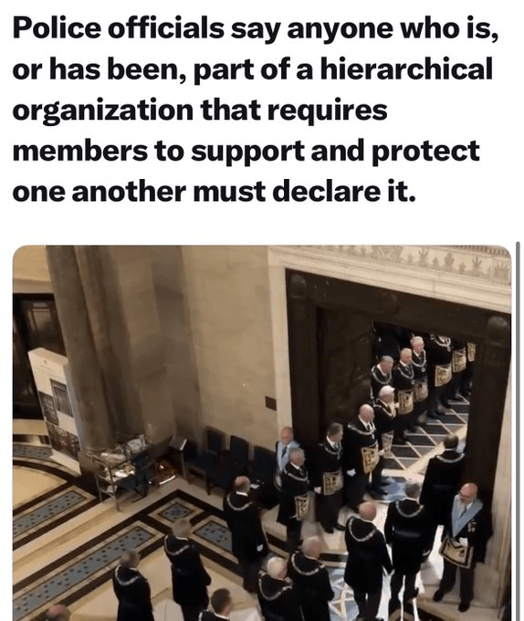 Η πολιτική: Η Μητροπολιτική Αστυνομία απαιτεί από τους αστυνομικούς και το προσωπικό να δηλώνουν την τρέχουσα ή την προηγούμενη ιδιότητά τους ως μέλη ιεραρχικών ομάδων όπου τα μέλη υποστηρίζουν το ένα το άλλο, στοχεύοντας συγκεκριμένα τους Ελευθεροτέκτονες.