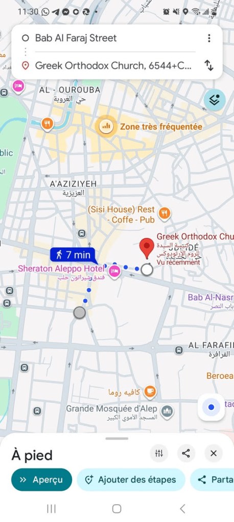 Αυτός είναι ο χάρτης ΦΩΤΟ 1. Ο γκρι κύκλος υποδεικνύει το σημείο όπου συνελήφθη κι ανατινάχθηκε ο τρομοκράτης κοντά στο αστυνομικό τμήμα Bab al-Faraj. Η κόκκινη κουκκίδα υποδεικνύει την τοποθεσία της εκκλησίας της Παναγίας, η οποία βρίσκεται επίσης δίπλα σε αρκετές άλλες παλιές εκκλησίες και την Ελληνορθόδοξη Μητρόπολη. Τα δύο σημεία απέχουν μεταξύ τους 5 λεπτά με τα πόδια.