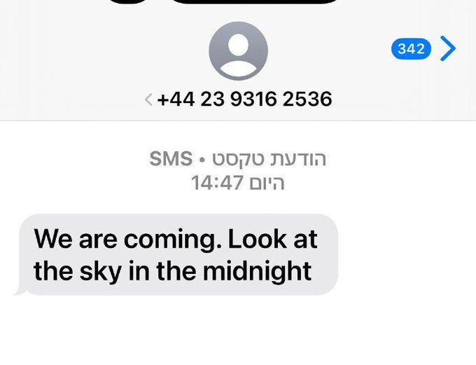 Χιλιάδες Ισραηλινοί έλαβαν ένα μήνυμα στα τηλέφωνά τους που έγραφε: «Ερχόμαστε, κοιτάξτε τον ουρανό τα μεσάνυχτα» αναφέρει τώρα το Εβραικό κανάλι 12. Άλλον περιμένουν .. άλλους θα έρθει; Ποιος θα είναι o ερχόμενος..;