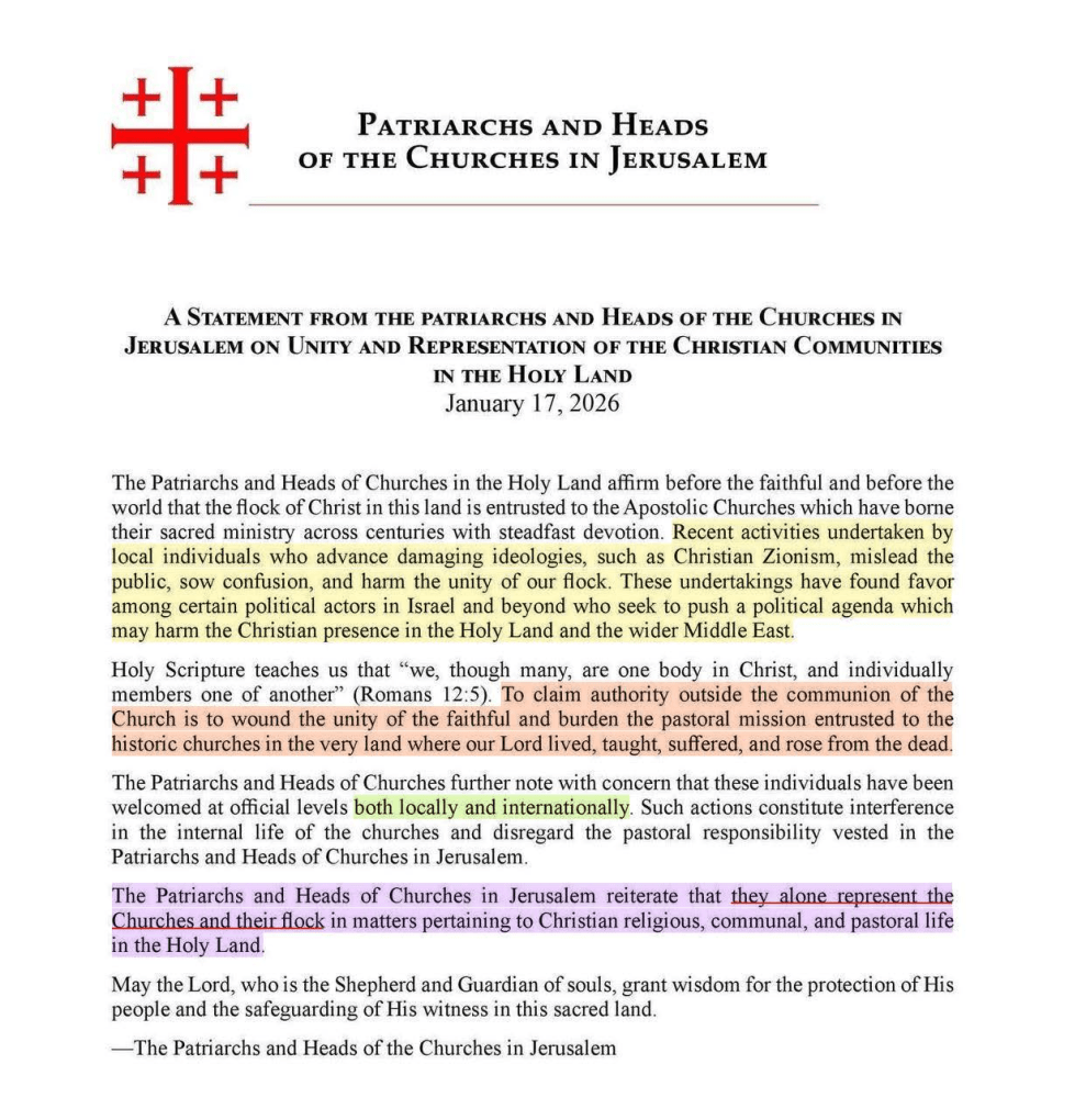 Σε δήλωση που εξέδωσαν το Σάββατο, οι Πατριάρχες και οι Επικεφαλής των Εκκλησιών στην Ιερουσαλήμ δήλωσαν ότι πρόσφατες δραστηριότητες τοπικών ατόμων που προωθούν αυτό που περιέγραψαν ως «επιζήμιες ιδεολογίες, όπως ο Χριστιανικός Σιωνισμός», έχουν παραπλανήσει το κοινό, έχουν σπείρει σύγχυση και έχουν βλάψει την ενότητα των χριστιανικών κοινοτήτων.