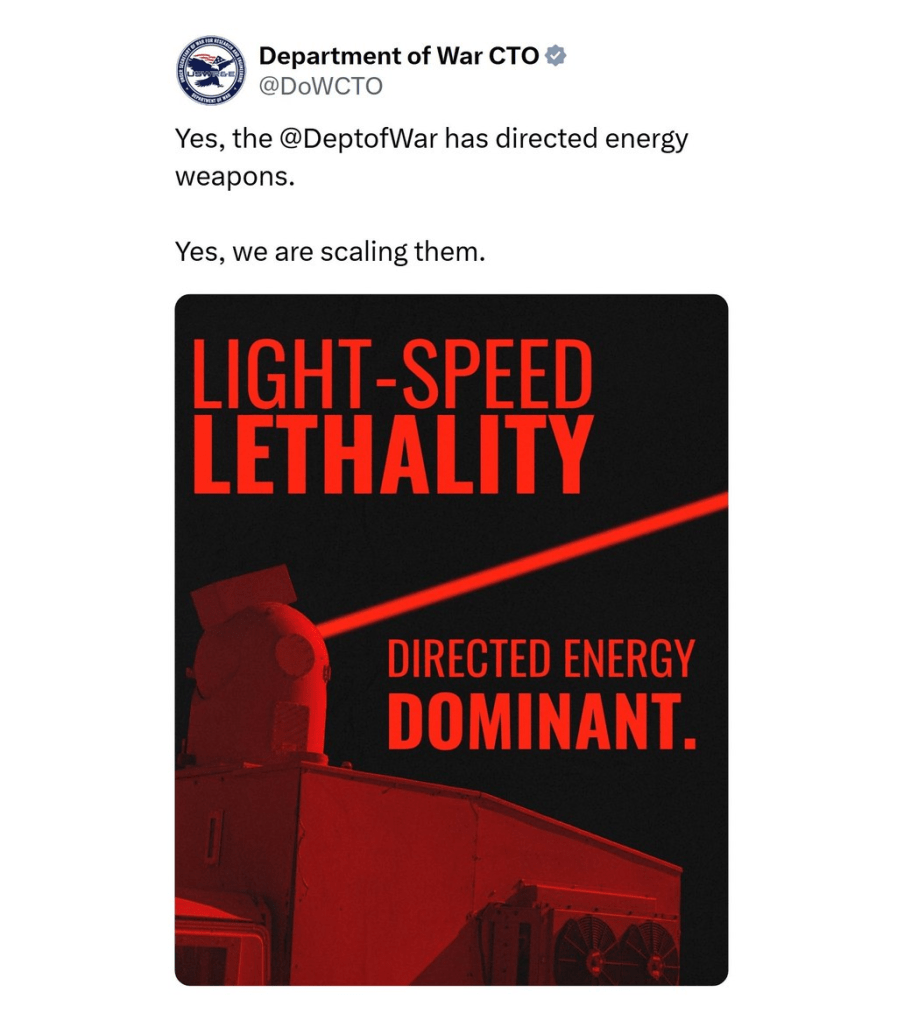 Το μήνυμα, που επιβεβαιώνει ότι το Πεντάγωνο διαθέτει όπλα κατευθυνόμενης ενέργειας, όπως λέιζερ υψηλής ισχύος και μικροκύματα, παρουσιάζει ένα γραφικό μιας συσκευής που στέλνει μια κόκκινη δέσμη λέιζερ στον ουρανό με τη λεζάντα “Θανατηφόρα με την ταχύτητα του φωτός. Κατευθυνόμενη κυρίαρχη ενέργεια”.