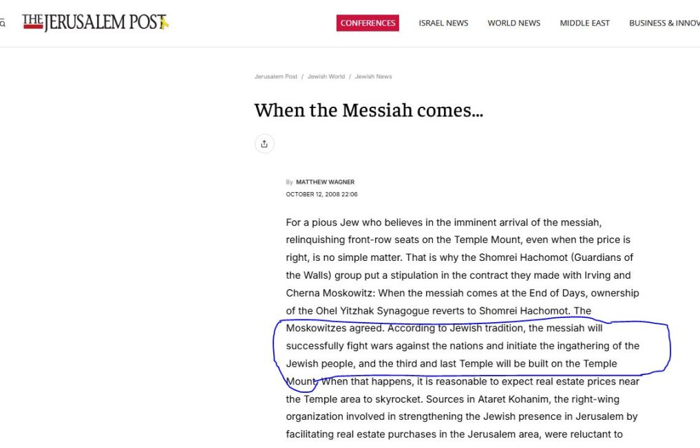 «Το Ινστιτούτο του Ναού», έτοιμο να ξεκινήσει την κατασκευή του Tρίτου Nαού.Σύμφωνα με την εβραϊκή παράδοση, ο ”Μεσσίας” θα πολεμήσει με επιτυχία πολέμους κατά των εθνών και θα ξεκινήσει την επιστροφή του εβραϊκού λαού στο Ισραήλ και θα χτιστεί ο Γ Ναός! Ήδη τα ακίνητα δίπλα στο Νάο έχουν γίνει μήλον της έριδος και οι τιμές έχουν εκτοξευθεί λόγω της επικείμενης όπως πιστεύουν άφιξης του.. Όλα αυτά στην JP…