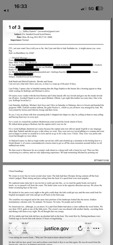 Την επόμενη ημέρα, θα κάνει την εμφάνισή του και ένας «Έλληνας ξένος διπλωμάτης» με τον οποίο θα έχουν γεύμα στο σκάφος του Βότη. Παρούσα εκείνες τις ημέρες φαίνεται να είναι από τα e-mail και η Πέγκι Σίγκαλ, η οποία είχε κατηγορηθεί ότι μεσολαβούσε σε αμερικανικά ΜΜΕ, ώστε να εξωραΐσει την εικόνα του Έπστιν μετά τις πρώτες αποκαλύψεις για το δίκτυο παιδικής μαστροπείας και να ρίξει λάσπη στην Βιρτζίνια Τζιουφρέ, που έκανε αποκαλύψεις για αυτό. Η Σίγκαλ, που αρνείται τις κατηγορίες, εμφανίζεται και σε παλαιότερες φωτογραφίες με τον Όλγα Γερουλάνου Βότη στην Πάτμο από το 2013….
