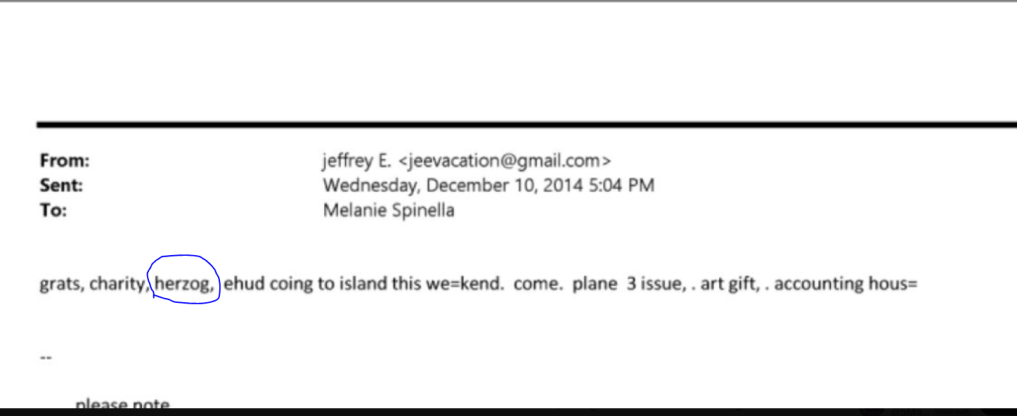 2.Ο Τζέφρι Έπσταϊν, σε ένα email του Δεκεμβρίου 2014 προς την εκτελεστική βοηθό του Λέον Ντ. Μπλακ, Μελάνι Σπινέλα, υπαινίχθηκε ότι ο Ισραηλινός πρόεδρος Ισαάκ Χέρτζογκ θα επισκεπτόταν το νησί του Έπσταϊν με τον Εχούντ Μπαράκ.Αρχείο Epstein