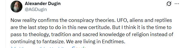 ”Τώρα η πραγματικότητα επιβεβαιώνει τις θεωρίες συνωμοσίας. Τα UFO, οι εξωγήινοι και τα ερπετά είναι το τελευταίο βήμα που πρέπει να γίνει σε αυτή τη νέα βεβαιότητα. Αλλά νομίζω ότι είναι η ώρα να στραφούμε στη θεολογία, την παράδοση και την ιερή γνώση της θρησκείας αντί να συνεχίζουμε να φαντασιωνόμαστε. Ζούμε στους Εσχάτους Καιρούς.” O no 1 Ρώσος διανοούμενος Alexander Dugin Διδάκτωρ Κοινωνιολογίας και Πολιτικών Επιστημών, Διδάκτωρ Φιλοσοφίας..