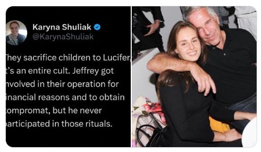 Ένα μήνυμα που αποδίδεται σε έναν λογαριασμό που φέρεται να συνδέεται με την Karyna Shuliak, σύντροφο του Jeffrey Epstein, ισχυρίζεται ότι παιδιά «θυσιάστηκαν στον Εωσφόρο» και ότι ο Epstein συμμετείχε για οικονομικούς και εκβιαστικούς λόγους, χωρίς στην πραγματικότητα να συμμετέχει στις τελετουργίες.