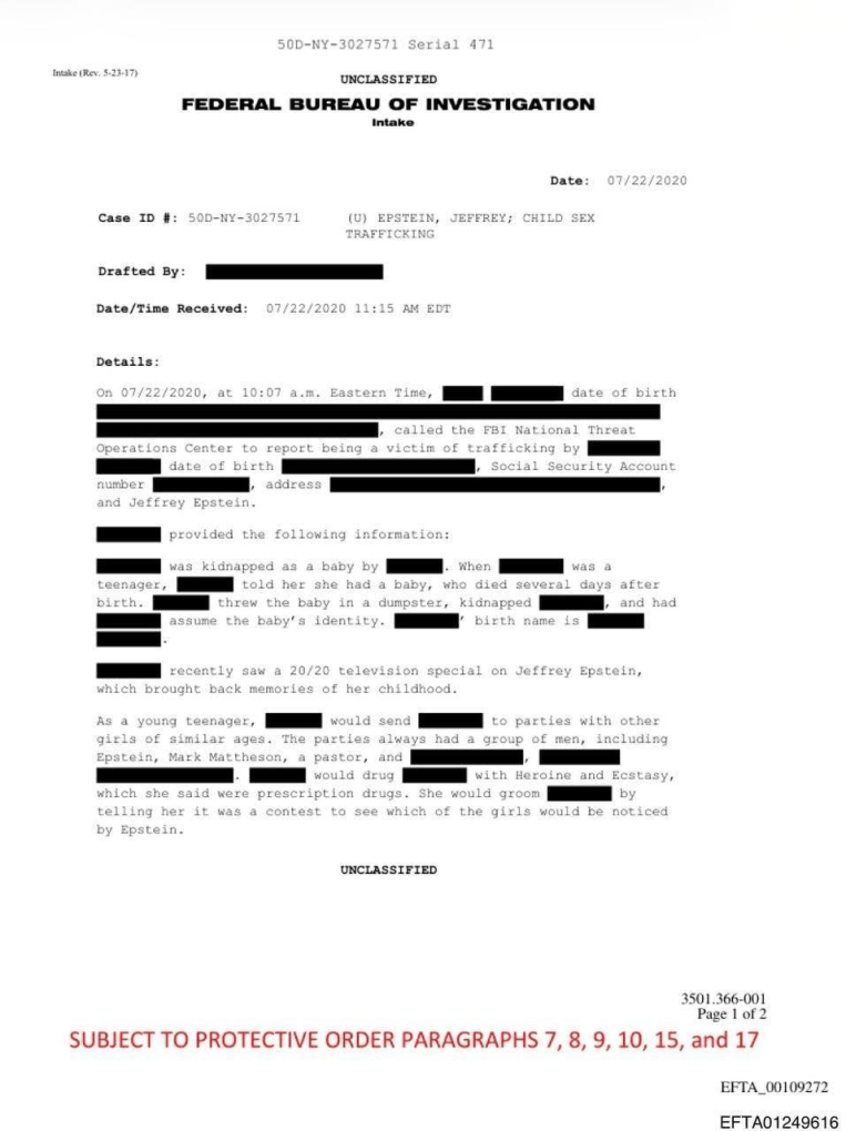 - Μια συγκλονιστική ερευνητική έκθεση του FBI του 2020 περιγράφει λεπτομερώς την ιστορία ενός νέου θύματος ενός πολυεπίπεδου σχεδίου απαγωγής και εκμετάλλευσης που συνδέεται με τον Τζέφρι Έπσταϊν, αποκάλυψε το Geopolitics Prime.