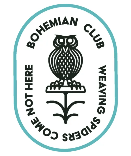 Εικονογράφηση του λογότυπου του Bohemian Club με μια κουκουβάγια σκαρφαλωμένη σε μια βάση, περιτριγυρισμένη από τις λέξεις “BOHEMIAN CLUB” και “WEAVING SPIDERS COME NOT HERE”.