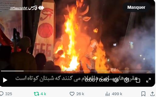 Iranians in the streets have torched a child-sacrifice demon Baal effigy.