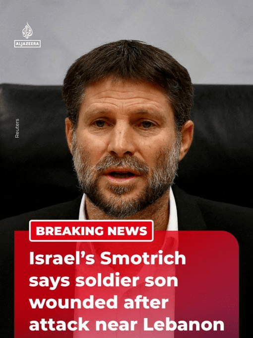 ”Ο ακροδεξιός Ισραηλινός υπουργός Οικονομικών Σμότριτς αναφέρει ότι ο στρατιώτης γιος του τραυματίστηκε σε επίθεση κοντά στον Λίβανο.” (Al Jazeera) O μεσσιανιστής Υπουργός Smotrich είναι αρχηγός του κόμματος Θρησκευτικός Σιωνισμός που ανήκει στον κυβερνητικό συνασπισμό του Νετανιάχου και προχθές υποσχέθηκε να κάνει Γάζα τη Βηρυτό.Ο γιος του τραυματίστηκε σε επίθεση κοντά στα σύνορα Λιβάνου όπου τραυματίστηκαν 8 Ισραηλινοί στρατιώτες.