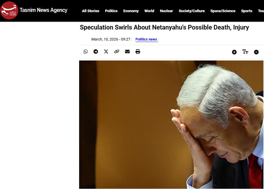 ΤΕΧΕΡΑΝΗ (Tasnim) – Ο εβραϊκός ιστότοπος του πρακτορείου ειδήσεων Tasnim εκτιμά ότι αυξάνονται οι εικασίες σε πηγές στην εβραϊκή γλώσσα σχετικά με τον πιθανό θάνατο ή τραυματισμό του Ισραηλινού πρωθυπουργού Μπενιαμίν Νετανιάχου.