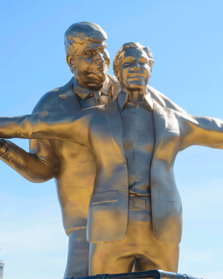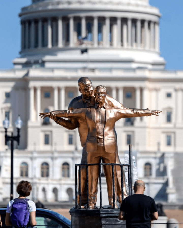 Ο Ντόναλντ Τραμπ αγκαλιάζει τον Τζέφρι Έπσταϊν μπροστά από το Καπιτώλιο. «Ο Βασιλιάς του Κόσμου» είναι το όνομα αυτού του γλυπτού που ανεγέρθηκε στο Εθνικό Πάρκο, το οποίο αναφέρεται σε μια εμβληματική σκηνή από την ταινία «Τιτανικός» . Εγκατεστημένο από την ανώνυμη καλλιτεχνική ομάδα The Secret Handshake, στοχεύει να καταγγείλει τους δεσμούς μεταξύ του νυν Αμερικανού προέδρου και του εγκληματία σεξουαλικών αδικημάτων Έπσταϊν. Πέρυσι, είχαν ήδη εγκαταστήσει ένα άγαλμα των δύο ανδρών να κρατιούνται χέρι-χέρι και να φαίνονται να χορεύουν, με τίτλο «Οι καλύτεροι φίλοι για πάντα».
