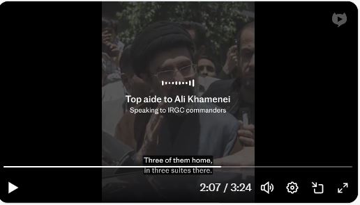 Ένα ηχογραφημένο βίντεο έφτασε στη βρετανική «Telegraph» στο οποίο ακούγεται ένας ανώτερος αξιωματούχος στο γραφείο του δολοφονημένου ηγέτη Αλί Χαμενεΐ να αναφέρει σε άλλους ανώτερους αξιωματούχους τα αποτελέσματα του βομβαρδισμού το πρωί της έναρξης του πολέμου, στον οποίο σκοτώθηκαν ο Χαμενεΐ ο πρεσβύτερος και πολλά από τα κορυφαία στελέχη του καθεστώτος. Λέει ότι ο διάδοχος Μοτζτάμπα επέζησε μόνο επειδή είχε βγει για μια βόλτα στην αυλή λίγα λεπτά νωρίτερα – και ο πύραυλος χτύπησε ακριβώς τη στιγμή που ανέβαινε τις σκάλες.
