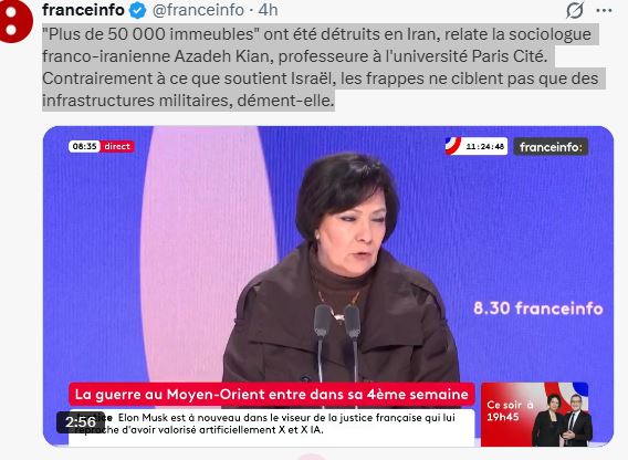 «Περισσότερες από 50.000 πολυκατοικίες» έχουν καταστραφεί στο Ιράν, αναφέρει η γαλλο-ιρανή κοινωνιολόγος Azadeh Kian, καθηγήτρια στο Πανεπιστήμιο Paris Cité. Σε αντίθεση με όσα ισχυρίζεται το Ισραήλ, οι επιθέσεις δεν στοχεύουν μόνο σε στρατιωτικές υποδομές, ισχυρίζεται. Franceinfotv