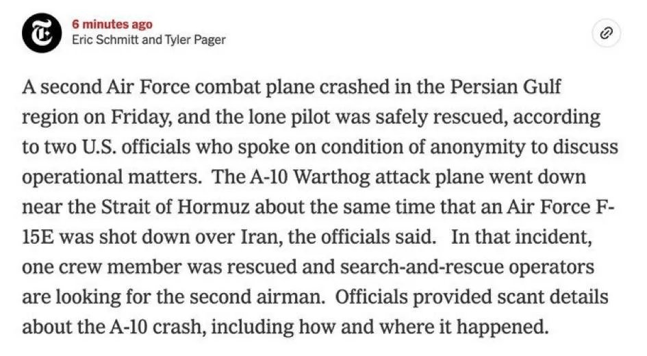 Σύμφωνα με τελευταίες πληροφορίες από Telegraph ένα δεύτερο μαχητικό των ΗΠΑ συνετρίβη στον Περσικό Κόλπο την Παρασκευή και ο πιλότος ασφαλώς διασώθη σύμφωνα με 2 Αμερικανούς αξιωματούχους που μίλησαν υπό την προυπόθεση της ανωνυμίας. Το Α10 Warthog επιθετικό αεροπλάνο έπεσε κοντά στα Στενά του Ορμούζ την ίδια ώρα που ένα μαχητικό F15E καταρρίφθηκε ενώ ήταν πάνω από το Ιράν, είπαν οι επίσημοι. Σε αυτό το επεισόδιο ένα μέλος τους πληρώματος διασώθηκε και εκτελούνται επιχειρήσης έρευνας και δια΄σωσης και για το δεύτερο μέλος. Οι αξιωματούχοι προέβησαν σε λεπτομέρειες για τη συντριβή του Α 10 συμπεριλαμβανομένων του που και πως συνέβη.. Άρα 2 αεροπλάνα των ΗΠA σήμερα καταρρίφθηκαν ένα Α10 διασώθηκε ο πιλότος κι ένα F15E όπου ο ένας πιλότος διασώθηκε κι ο άλλος είναι ήδη αιχμάλωτος των Ιρανών ή διαφεύγει και τον ψάχνει όλο το Ιράν και οι Αμερικάνοι!! Πληροφορίες αναφέρουν πως καταρρίφθηκε κι ελικόπτερο των ΗΠΑ.