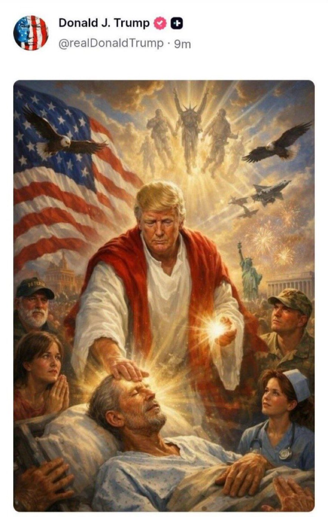 Σήμερα μέρες Πάσχα ο Τραμπ που στην αγγλική σημαίνει αλήτης ανέβασε μια εικόνα όπου εμφανίζεται ως Ιησούς Χριστός που θεραπεύει και κάνει θαύμα ιάσεως.. Από πάνω του πετούν αετοί και μαχητικά και ιπτάμενοι ο ένας κερασφόρος.
