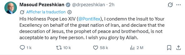 ”Αγιότατε Πάπα Λέοντα ΙΔ΄ καταδικάζω την προσβολή προς την Εξοχότητά Σας εκ μέρους του μεγάλου έθνους του Ιράν και δηλώνω ότι η βεβήλωση του Ιησού, του προφήτη της ειρήνης και της αδελφοσύνης, δεν είναι αποδεκτή από κανένα ελεύθερο άτομο. Σας εύχομαι δόξα στον Θεό (Αλλάχ).”