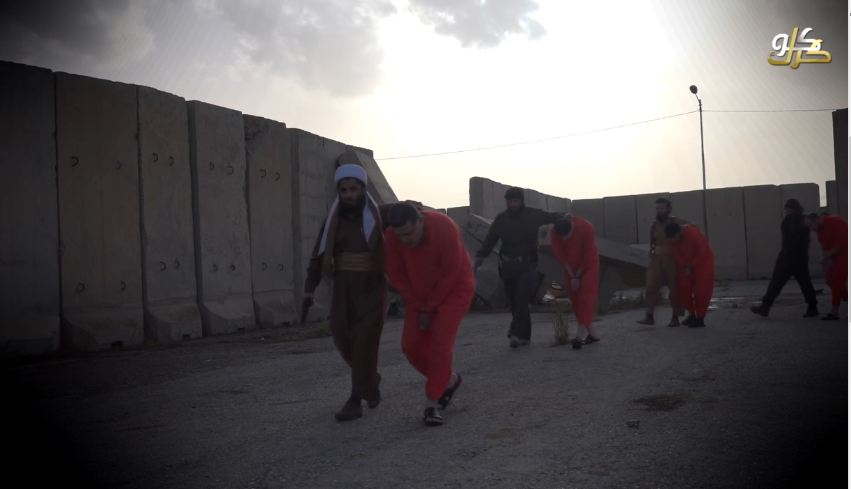 Nέο βίντεο προπαγάνδας ανέβασε σε λογαρισμό της η οργάνωση Ισλαμικό Κράτος πριν από 11 ώρες.Σε αυτό εμφανίζονται και πάλι οι 16 τουλάχιστον κούρδοι μαχητές να είναι σε προαύλιο χώρο φυλακής και να περιφέρονται ανά ένας και από έναν δήμιο δεσμοφύλακα σε κυκλική τροχιά που θυμίζει σκηνές από Γκουαντάναμο όπως και οι πορτοκαλί φόρμες που φέρουν οι σιδεροδέσμιοι αιχμάλωτοι.To βιντεοσκοπημένο μήνυμα ονομάζεται “η θεραπεία της καρδιάς των πιστών”.Oι 21 παρουσιάζονται ως 16 peshmergas, 2 αξιωματικοί του ιρακινού στρατού και 3 αστυνομικοί από το Kirkouk.Πηγές κουρδικές ταυτοποίησαν ότι οι σκηνές γυρίστηκαν εδώ και μια εβδομάδα στην περιοχή Hawija, 50 χλμ από Kirkouk.