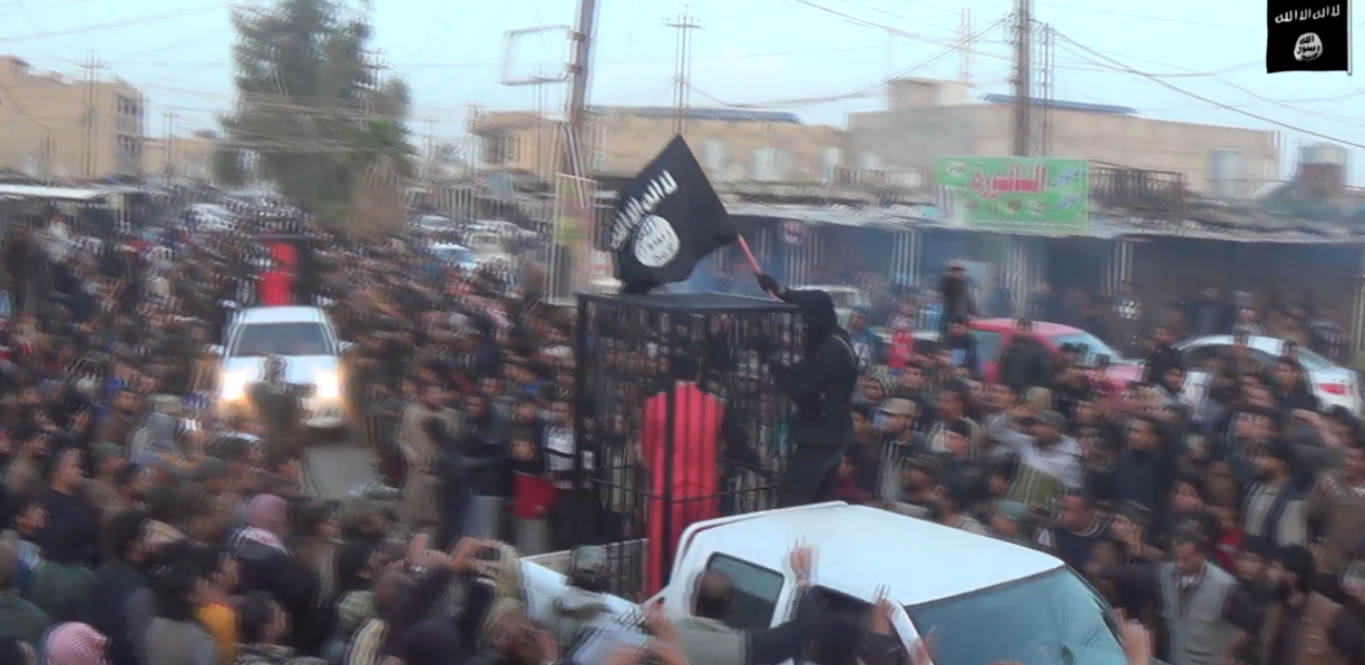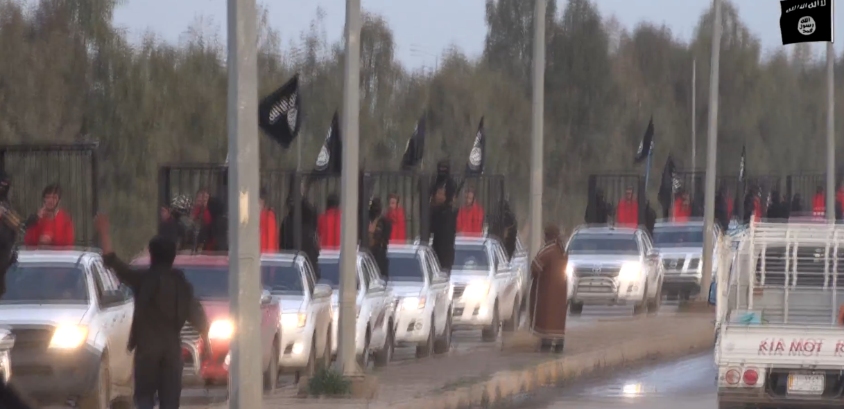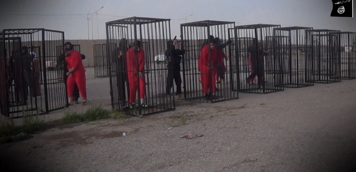 Μεταξύ των μελλοθάνατων υπάρχουν και άτομα πολύ νεαρής ηλικίας που ενδεχομένως να μην έχουν ενηλικιωθεί.Μεταξύ των σιδεροφράκτων αυτών κατασκευών είναι ακροβολισμένοι πάνοπλοι τζιχαντιστές.Στις 15 Φεβρουαρίου η οργάνωση είχε δώσει στη δημοσιότητα ένα πρώτο βίντεο συνοπτικό των 4΄ που αφορούσε το ίδιο θέμα.Πολλοί θεώρησαν τότε ότι οι κούρδοι μαχητές θα είχαν την ίδια τύχη με τον ιορδανό πιλότο Maaz al-Kassasbeh που η Daesh έκαψε ζωντανό σε παρόμοιο κελλί.Η εξέλιξη είναι διαφορετική στη συνέχεια του βίντεο εμφανίζονται εικόνες από την διέλευση της αυτοκινητομπής με τους ομήρους στα κλουβιά σε πόλη. Διασχίζουν δρόμο της πόλης κοντά στο Κιρκούκ που είναι κατάμεστος από ενθουσιώδες πλήθος.Στην καρότσα των ολοκαίνουργιων ημιφορτηγών μοντέλων της TOYOTA που έχουν τοποθετηθεί τα φορητά κελλιά με τους ομήρους υπάρχουν λάβαρα της οργάνωσης και δεσμοφύλακες.Διακρίνονται ως και τα λουκέτα και τα κλειδιά στην καγκελόπορτα της κατασκευής.Υπάρχουν πάρα πολλά παιδιά που συμμετέχουν στην υποδοχή των κρατουμένων.Η πόλη αυτή είναι κοντά στην πλούσια σε αποθέματα πετρελαίου Kirkouk στο βόρειο Ιράκ.