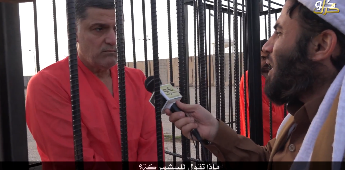 Στη συνέχεια και πάλι εκτίθενται σε σιδερόφρακτα κλουβιά και ένας δήθεν ρεπόρτερ της οργάνωσης τους παίρνει συνεντεύξεις. O δήθεν ρεπόρτερ λέει ότι οι μαχητές peshmergas αιχμαλωτίστηκαν από την ISIS.Το CNN δεν μπορεί να επαληθεύσει από ανεξάρτητη πηγή ως τώρα την αυθεντικότητα του βίντεο.Αλλά δείχνει τουλάχιστον 21 ομήρους.Ο ψευδορεπόρτερ έχει μικρόφωνο με το logo ISIS.Οι αιχμάλωτοι στην συνέντευξη παραδέχονται ότι είναι peshmergas.Η πλειοψηφία αυτών λέει ότι κατάγεται από το Kirkouk.Οι ερωτώμενοι υπό την ασφυκτική ψυχολογική πίεση που υφίστανται εξαναγκάζονται να καλέσουν τους συντρόφους τους να σταματήσουν να μάχονται κατά της ISIS. Ένας αιχμάλωτος περιγράφεται ως αξιωματικός του ιρακινού στρατού.Πρόκειται για τον ιρακινό στρατηγό διοικητή της 4ης Μονάδας.